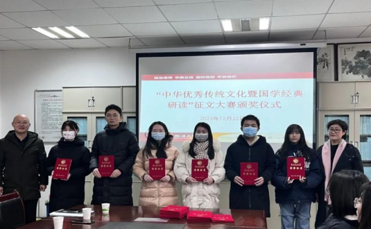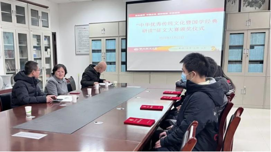 12月22日下午,大赛颁奖仪式于格物楼208会议室隆重举行。校党委宣传部副部长高见、教务处副处长王若梅、我院党委书记寇汉军、院长山小琪、党委副书记、副院长杨军、中哲教研室俞秀玲副教授出席了颁奖仪式。寇汉军主持本次活动。