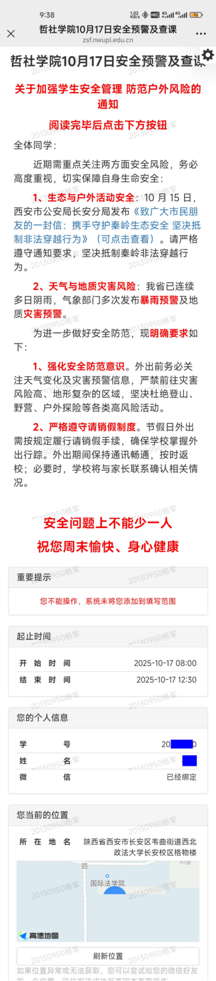 为确保安全教育工作落地见效,学院对全体在籍学生开展了全覆盖式排查与提醒。据统计,学院共有在籍学生595人,截至10月17日,所有学生均已查阅学院发布的预警通知及安全要求,实现信息触达率100%。